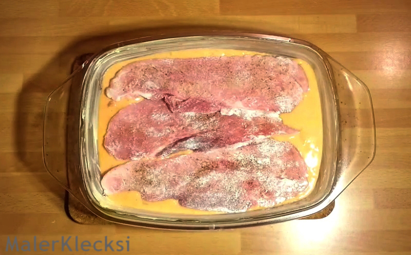 Die Schnitzel werden ebenfalls mit Salz und Pfeffer gewürzt und anschließend in Mehl gewendet. So legt ihr sie nun in die Auflaufform unf bedeckt sie mit der restlichen Soße.
