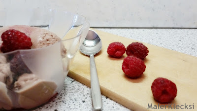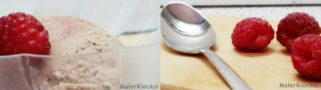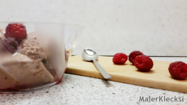 Das Eis könnt ihr natürlich noch mit den unterschiedlichsten Toppings versehen, z. B. Sahne, Streusel, Schokosoße oder Früchten. Wie ihr seht habe ich mich für Himbeeren aus eigener Ernte entschieden.