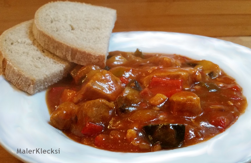 Jetzt noch Wasser, Zigeunersoße, Ketchup und Gewürze einrühren und im geschlossenen Bräter für 1,5 Stunden auf der untersten Schiene bei 200°C im Backofen garen.