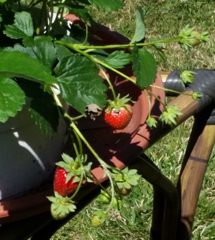 Erdbeeren kann man nie genug essen, ich zumindest. Deshalb habe ich mir im Frühjahr zwei Ampeln mit Hängeerdbeeren gekauft. Die sind auch schön gewachsen, leider bildeten sich nur neue Triebe, keine Blüten und damit auch keine Früchte. Das war ja nicht ganz so der Sinn der Sache.