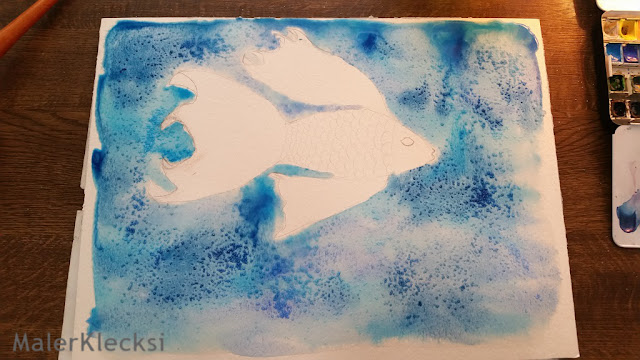 Dann kommt der Fisch dran. Da ich ihn sehr kräftig haben wollte, habe ich das Papier hier nicht angefeuchtet.