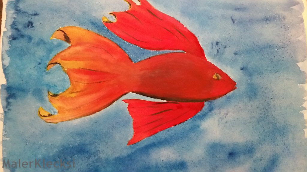 Den Fisch habe ich von dunkel nach hell, also von Rot zu Orange gemalt. Dazu habe ich mehrere Schichten aufgetragen, bis die Farbe die von mir gewünschte Intensität hatte.