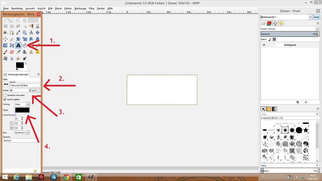 3. die gewünschte Größe, Deckkraft und evtl. Winkel einstellen