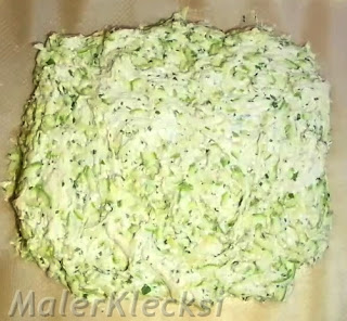 Als Nächstes die mit der Hand ausgedrückten Zucchini und die gehackten Kräuter mit dem Teig verkneten.